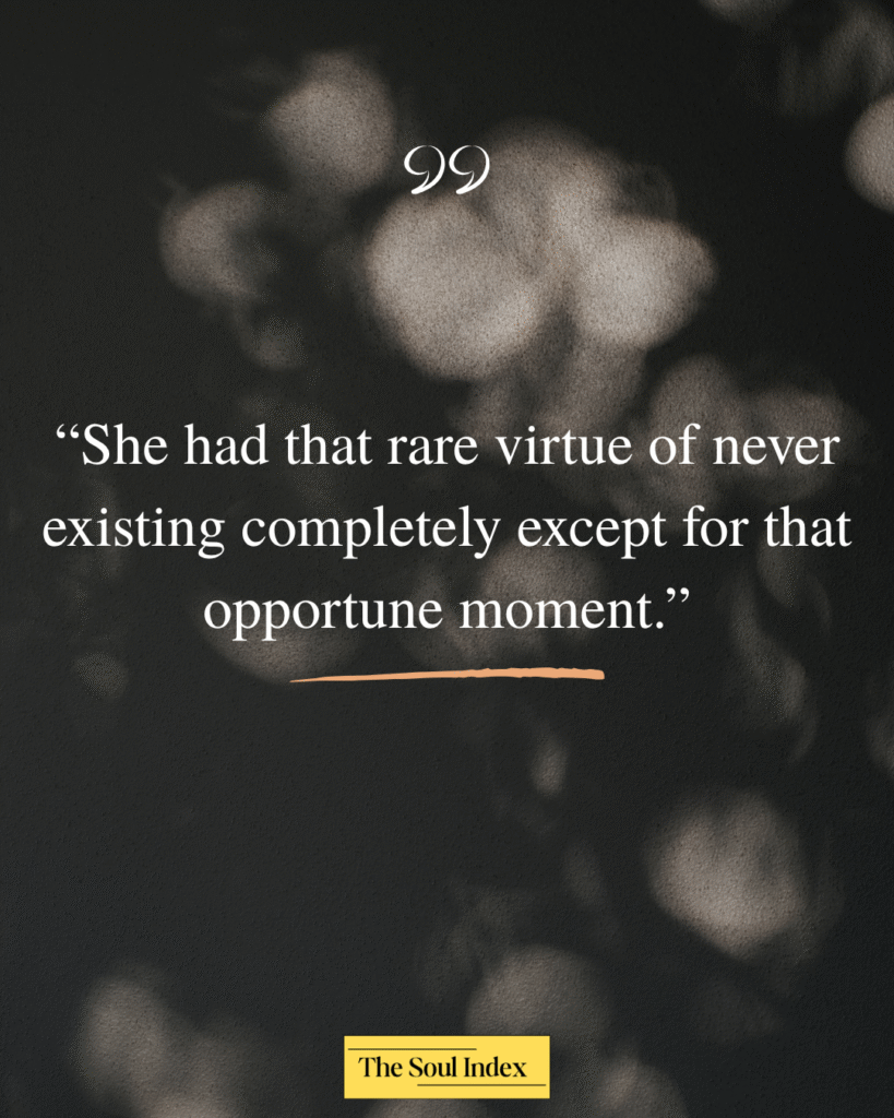 21. “She had that rare virtue of never existing completely except for that opportune moment.”